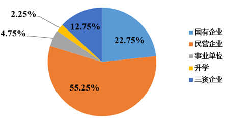 2022年硕士研究生毕业为40人,其中8人进入国有企业占毕业总人数的22.75%22人进入民营企业,7人进入三资企业,分别占毕业总人数的55.25%12.75%1人进入高校继续深造,2人进入进入事业单位,分别占毕业总人数的2.25%4.75%。具体情况如下: