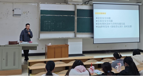 张光宇向同学们传达了集团关于研究生寒假留校期间安全管理要求,分别从宿舍安全、人身安全、留校及返校注意事项等作出强调。一是留校同学要遵守校规校纪,假期期间严格遵守宿舍管理规定,注意用电安全。二是完成科研任务后,务必在离校前将个人去向及离校具体时间告知辅导员和导师,保持通讯畅通。三是加强“朋辈互助意识”,充分发挥员工自我教育主体性,确保同学们留校期间学习生活平稳安全。