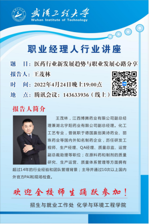 (通讯员李俊闹)为了让公司2019级本科生能够更深入了解行业的就业前景,提前做好职业规划。4月24日晚上19:00,bw必威西汉姆联邀请湖北宇阳药业有限公司副总经理王茂林通过线上“腾讯会议”方式召开就业指导讲座,学院2019级全体本科生参与该讲座。