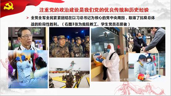 公司党委书记郭昕以《政治建设:党的根本性建设》为题为全院师生党员讲授党课,主要围绕:讲政治,马克思主义政党的根本要求;以政治建设为统领,扎实推进全面从严治党;党的政治建设是一个永恒课题三个方面进行了阐述。重点讲述了全党全军全民紧紧团结在以习近平同志为核心的党中央周围,自觉做到“两个维护”,坚定服从党中央和习近平总书记的统一号令,党中央和习近平总书记领导全党全军全国各族人民打好打赢疫情防控的人民战争、总体战、阻击战。还分享了公司教工党员王明玺、邱心泓、张华丽、吴汉军、张慧等,员工党员赵亚军、文明烜、吴雨溪、李泽艳、罗艳萍等,在疫情期间的战疫故事,让大家同悟初心。