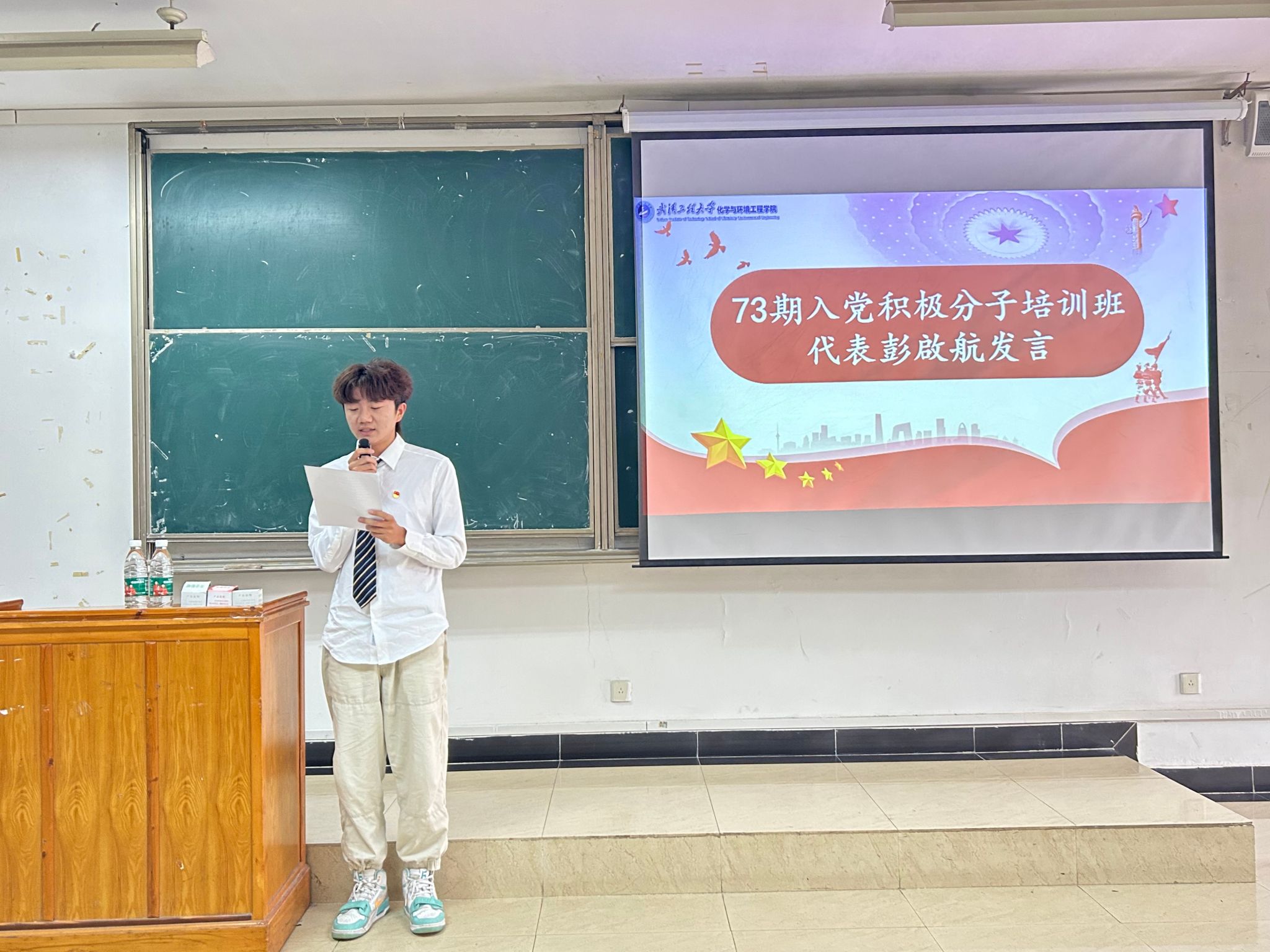 第73期入党积极分子培训班学员彭啟航代表全体学员郑重承诺,必将以高度的责任感和主人翁精神,密切联系群众,在工作学习和社会生活中起先锋模范作用,用实际行动和优异成绩接受党的考察和检验,争取早日加入中国共产党,为实现共产主义奋斗终身!