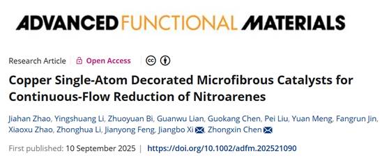Jiahan Zhao, Yingshuang Li, Zhuoyuan Bi, Guanwu Lian, Guokang Chen, Pei Liu, Yuan Meng, Fangrun Jin, Xiaoxu Zhao, Zhonghua Li, Jianyong Feng, Jiangbo Xi*, Zhongxin Chen*, Copper Single-Atom Decorated Microfibrous Catalysts for Continuous-Flow Reduction of Nitroarenes. Adv. Funct. Mater. 2025, e21090. https://doi.org/10.1002/adfm.202521090
