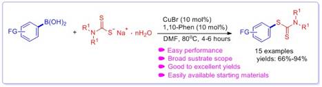 二硫代氨基甲酸苯酯有着出色的抑制杂草生长能力,故而受到了有机合成化学家们的广泛关注。合成此类化合物通常采用对水敏感的金属有机试剂(如有机锌试剂、有机镁试剂)和碘代芳烃反应,但金属有机试剂往往需要在较为苛刻的条件(无水无氧)下制备,操作较为繁琐;抑或使用一些不安全的(芳基重氮盐、二硫化碳)、或者昂贵的试剂(芳基高价碘试剂)作为反应底物。高明源同学在董志兵老师指导下,采用廉价易得的苯硼酸作为芳基源,与廉价易得的二烷基二硫代氨基甲酸钠反应,在廉价金属催化剂CuBr(10%摩尔当量)的催化下,高效的合成了这些化合物。