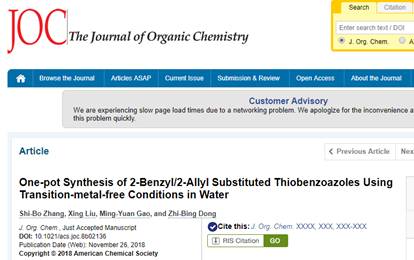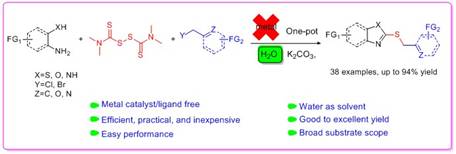 2-苄基 / 2-烯丙基取代的硫代苯并唑类化合物已经被证实有着广泛的生物活性和药学活性(抗真菌活性),合成这些苯并杂环的方法通常以2-巯基苯并杂环和一些烯丙基卤/苄基卤试剂反应,或者使用有一定毒性的过渡金属催化剂分步催化合成,故而在一定程度上限制了这些方法的应用。张士博同学在董志兵教授指导下,将邻氨基苯酚(或邻氨基苯硫酚、邻苯二胺)和廉价易得的硫化试剂二硫化四甲基秋兰姆(TMTD)以及烯丙基/苄基卤代物反应,在水中一锅法合成了相应的2-苄基 / 2-烯丙基取代的硫代苯并唑类化合物,本方法无需使用金属催化剂、操作简便(无需分离中间体)、对环境友好(在水相反应)、反应高效(产率最高可达94%)、底物适用性广,为合成这类有着药学活性的化合物提供了一条简便的途径。