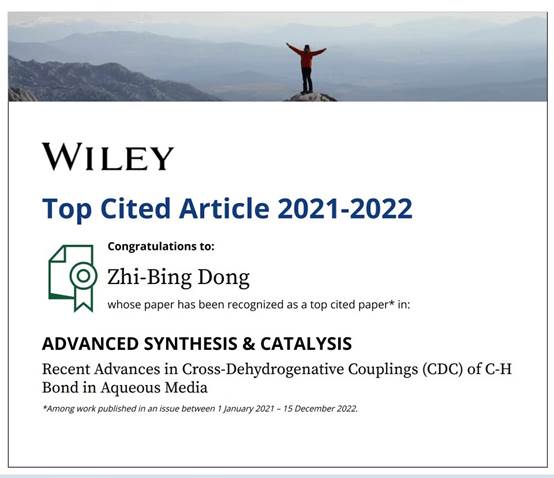 (通讯员 程然)据国际著名学术期刊出版集团WILEY统计的数据,近期,bw必威西汉姆联董志兵教授课题组在国际著名有机化学期刊《高等合成催化》Advanced Synthesis & Catalysis发表的论文“RecentAdvances in Cross-Dehydrogenative Couplings (CDC) of C-H Bond in Aqueous Media”入选Top Cited Article(2021-2022),该论文同时也入选WEB OF SCIENCE数据库高被引论文,论文的第一作者为硕士生彭康。论文链接:https://onlinelibrary.wiley.com/doi/abs/10.1002/adsc.202001358