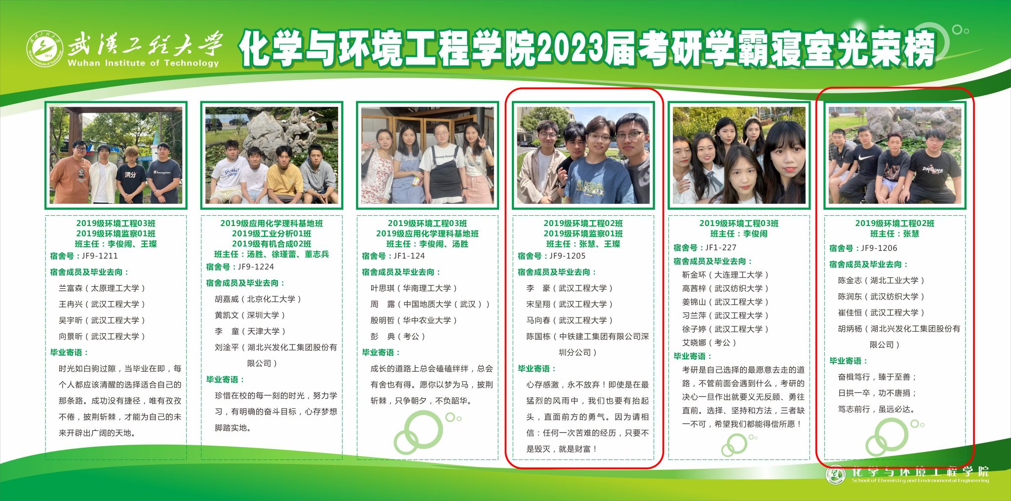 受疫情影响,考研之路异常艰难,班级形成了以寝室为单位的“抱团复习”,规律作息,相互监督、相互鼓励、共同进步的良好学习氛围。期间,张慧老师也多次查访,挨个电话和短信沟通,及时了解班级考研学子的困难和学习状态,是否转阳,是否需要帮助,尽量为大家排忧解难。考研结束,班级取得了可喜的成绩,一些同学顺利考入双一流、211等重点高校。如胡兴宇考入厦门大学,王菲考入中国地质大学(武汉),卫丁瑞考入中国海洋大学,郭培芸和胡思琪考入华中农业大学,李豪取得2019级环工专业五个班考研最高分(392分)的好成绩,成为公司环工专业研究生。班级的“抱团学习”取得了良好效果,教辅9-1205和教辅9-1206两个班级寝室荣登学院2023届考研“学霸寝室”光荣榜。