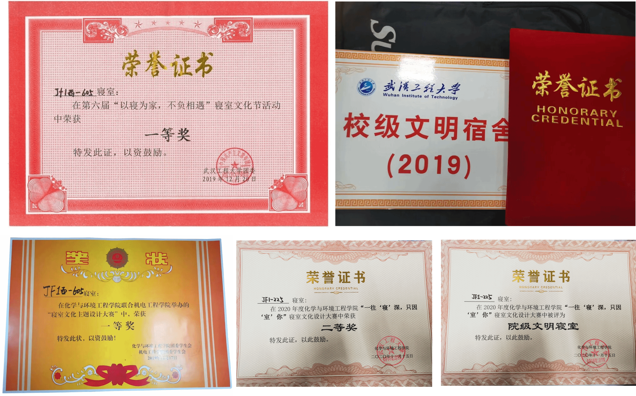 班级同学团结友爱,视寝室为家,同心同德共建文明寝室。教辅一(西区)605寝室荣获2019年度“寝室文化主题设计大赛”一等奖,在学校第六届“以寝为家,不负相遇”的寝室文化节活动中荣获一等奖,被授予校级文明寝室称号。教辅一(西区)225寝室在2020年度学院“一往‘寝’深,只因‘室’你”和“寝室文化节”中获得二等奖和院级文明寝室称号。