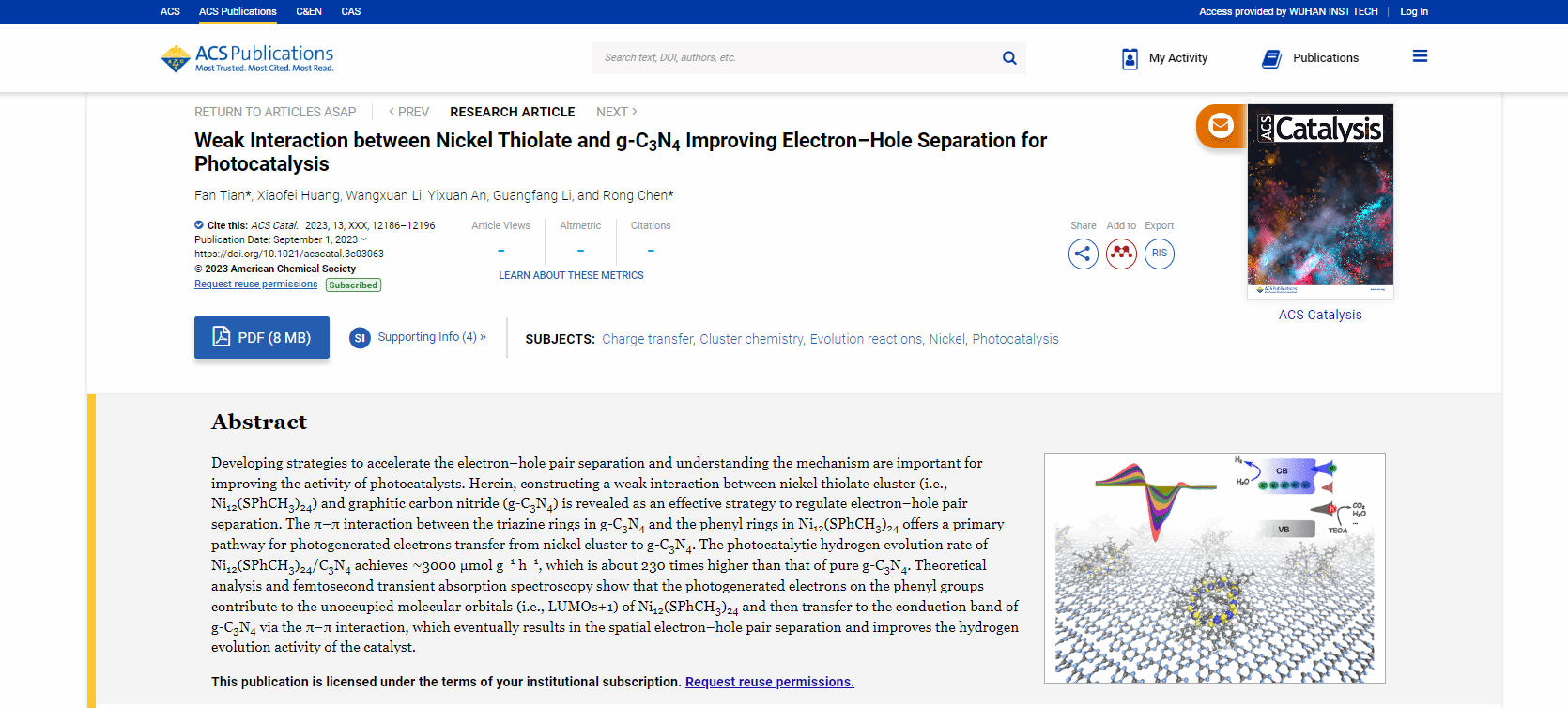 (通讯员:程然)近日,化学类国际著名刊物《ACS Catalysis》在线发表了公司青年教师田凡博士课题组题为“Weak interaction between nickel thiolate and g-C3N4 improving electron-hole separation for photocatalysis”的研究论文。该论文以对甲基苯硫酚为配体成功合成一种全新的环状Ni12团簇,将该团簇与g-C3N4通过简单的旋蒸方法复合,其光催化产氢活性在紫外光下可达纯相材料的230倍。结合理论计算与飞秒瞬态光谱表征研究了其光催化活性提升机制,发现Ni12团簇中配体苯环的存在对于其光催化活性提升至关重要。其通过与g-C3N4之间形成p-p堆积,沟通Ni12团簇中金属部分与g-C3N4之间的电荷转移,实现复合材料光生电子与空穴的有效分离,从而提高催化活性。结合理论与实验结果,作者提出了一种基于弱相互作用提升光生电子与空穴分离效率的策略,为高效光催化剂的设计提供了新的思路。该论文第一作者与通讯作者为田凡博士,bw必威西汉姆联为第一完成单位,武汉纺织大学陈嵘教授为共同通讯。