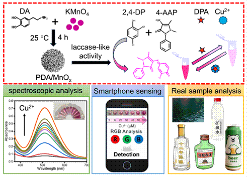 As a common trace element in the human body, Cu2+ plays a key role in various metabolic activities; however, its concentration imbalance can also lead to several diseases. Since copper equipment is often used in alcohol brewing, Cu2+ contamination in alcoholic beverages is a common issue. Therefore, accurate detection of Cu2+ content in beverage samples is crucial for ensuring food safety. This study describes a simple one-step method to prepare PDA/MnOx nanoparticles by stirring at room temperature. These nanoparticles exhibit excellent laccase-like activity, catalyzing the oxidation of 2,4-dichlorophenol and reacting with 4-aminoantipyrine to produce a pink product. D-penicillamine (DPA) acts as both an etchant for MnOx and a chelator for Cu2+, mediating the laccase-like activity of the PDA/MnOx nanoparticles. Based on this, a signal-on colorimetric detection system was constructed for the highly sensitive detection of Cu2+. Furthermore, by combining this system with a smartphone and using a color recognition app, instrument-free on-site analysis of Cu2+ in various alcoholic beverage samples can be achieved. This method provides a new strategy for designing nanomaterial-based heavy metal ion colorimetric sensors and holds significant application potential in beverage safety monitoring.